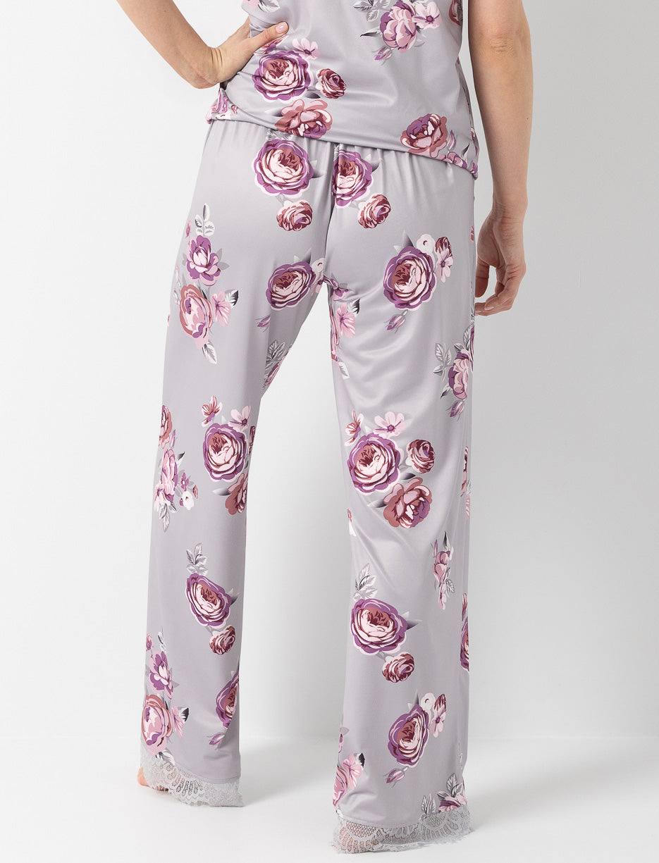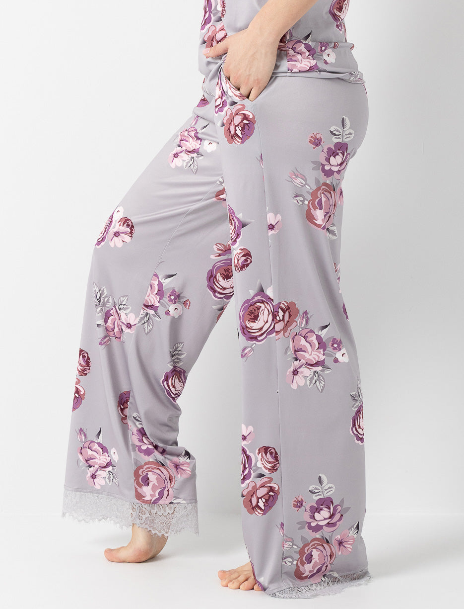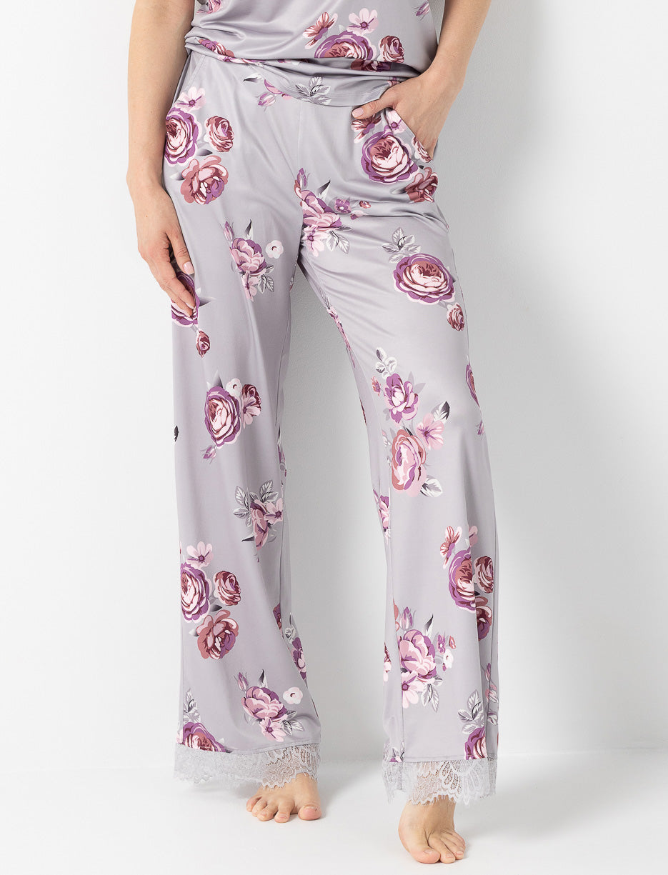 Confort absolu et charme fleuri s’unissent dans ce pantalon de pyjama à jambes larges, orné d’un joli détail en dentelle à l’ourlet.