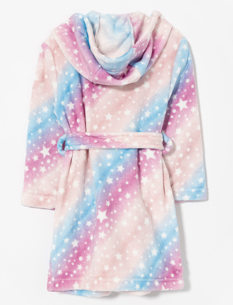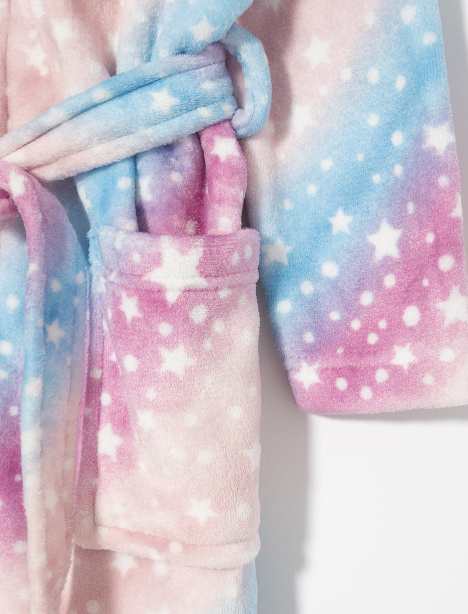 Une robe de chambre douce et colorée avec capuchon et ceinture, ornée d’un motif étoilé multicolore, parfaite pour envelopper votre fille de confort.