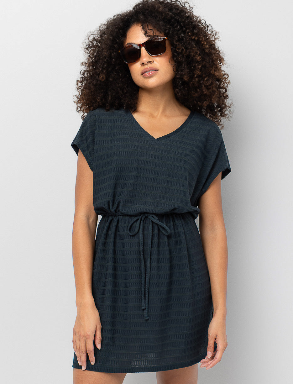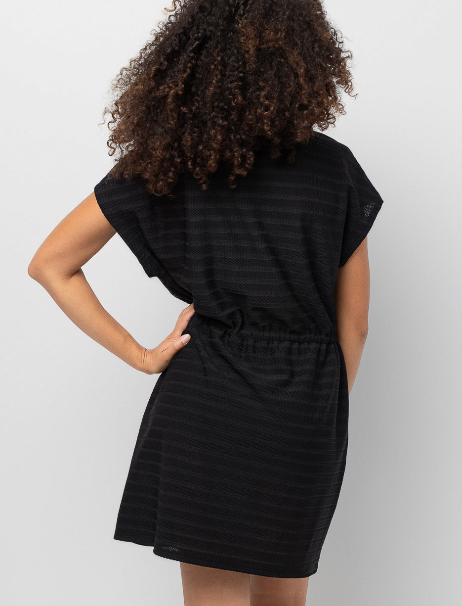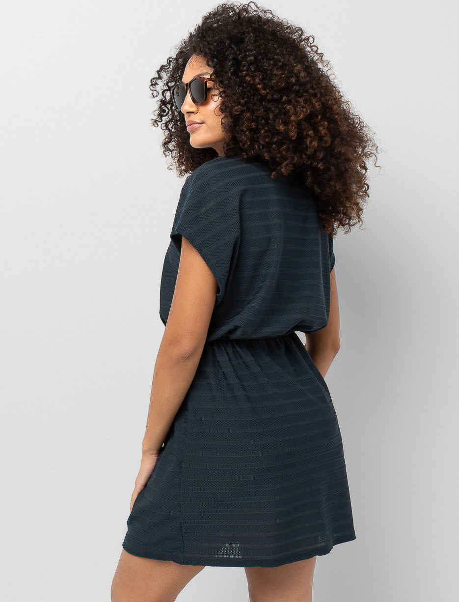 Glissez-vous dans cette robe par-dessus de maillot qui combine légèreté et aisance. Sa coupe ceinturée et son mesh rayé vous donnent un style décontracté parfait pour prolonger vos journées plage sans effort.