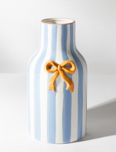 Apportez une touche de douceur à votre décor avec ce vase en céramique orné d’une jolie boucle et de rayures bleues et blanches. Parfait pour accueillir quelques fleurs ou égayer une étagère. Dimensions : 13 x 12,5 x 24,5 cm.