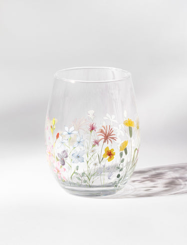 Élégant verre à vin sans pied décoré d’un motif fleuri délicat, parfait pour ajouter une touche lumineuse à vos moments de détente. Dimensions : 7,5 x 12,5 cm.